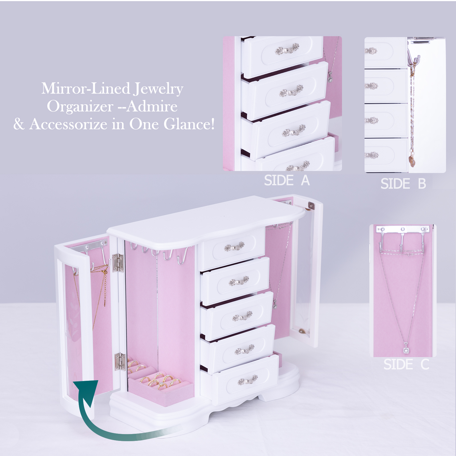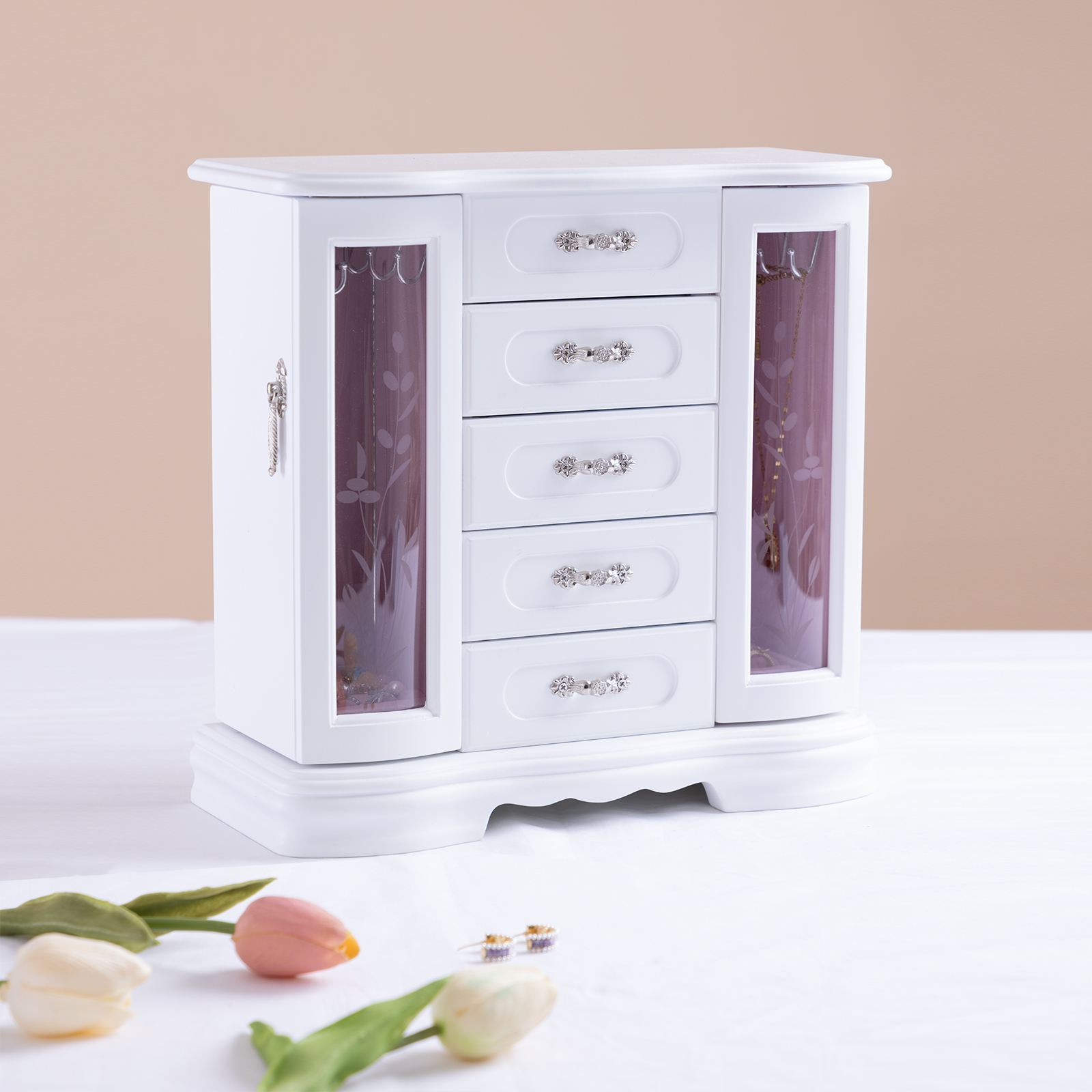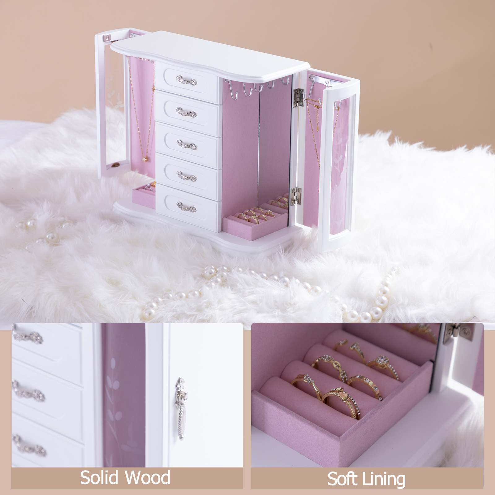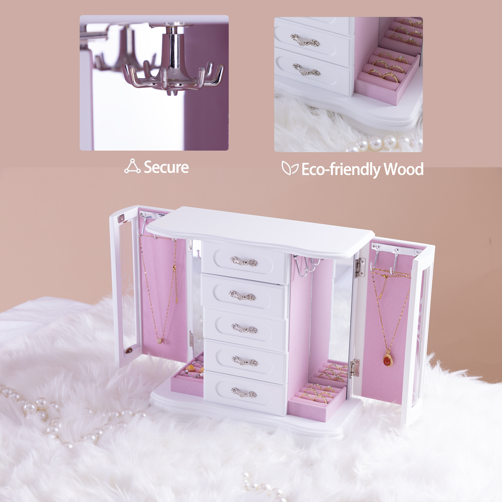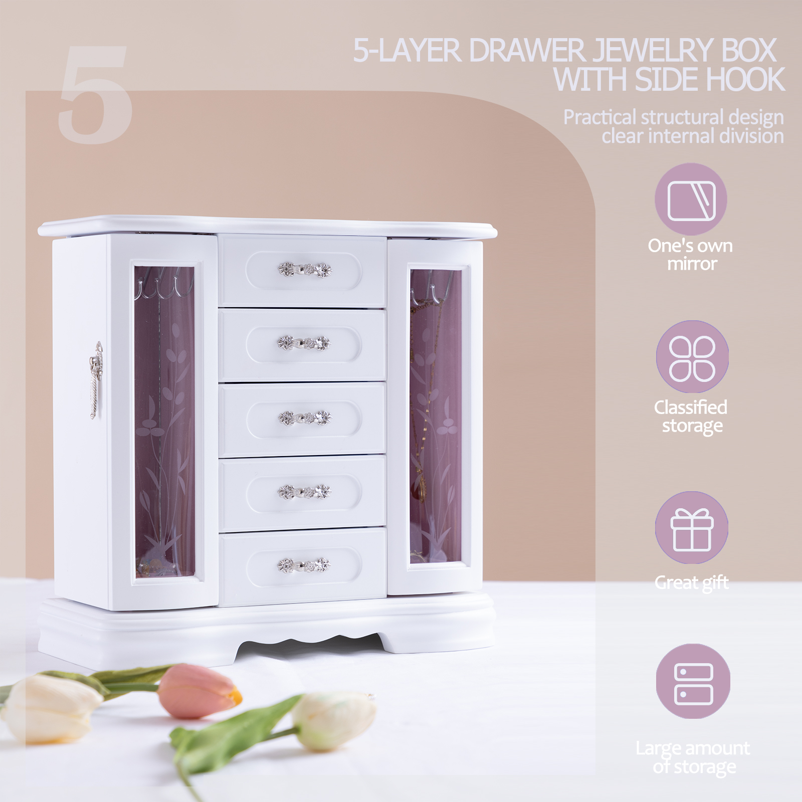 外观设计:这款珠宝收纳盒采用独特的设计,两侧均设有180°旋转门,提供宽敞的储物空间。五个宽敞的木质隔层非常适合收纳戒指、耳环和其他配饰。盒门上的复古装饰赋予这款多功能珠宝盒精致奢华的格调。