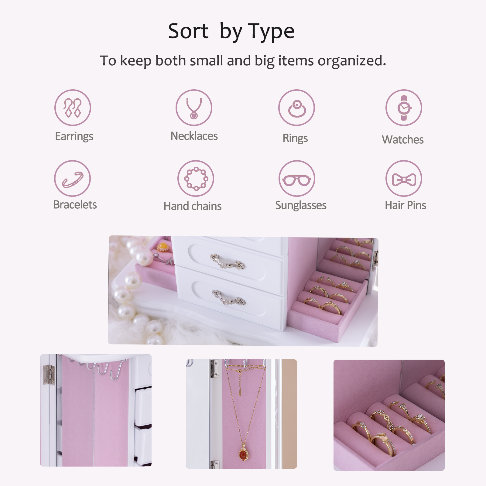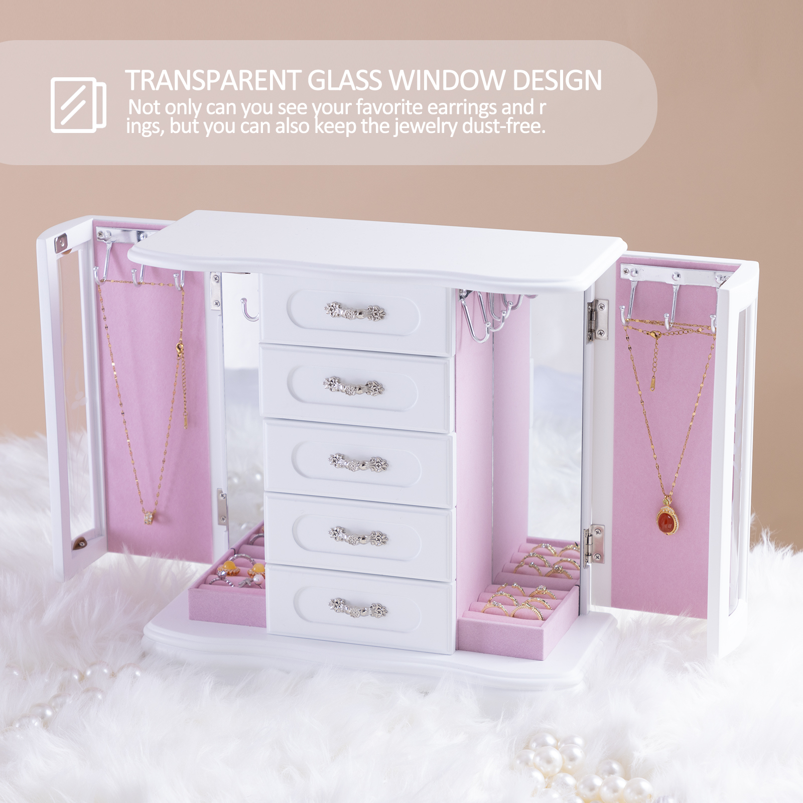 尺寸:11.7 x 4.96 x 11.4。珠宝盒体积小巧,却拥有充足的储物空间。优雅的白色外观使其成为任何场合的理想礼物。无论是母亲节、情人节,还是其他特殊的日子,白色珠宝柜都是向挚爱表达爱意的完美之选。