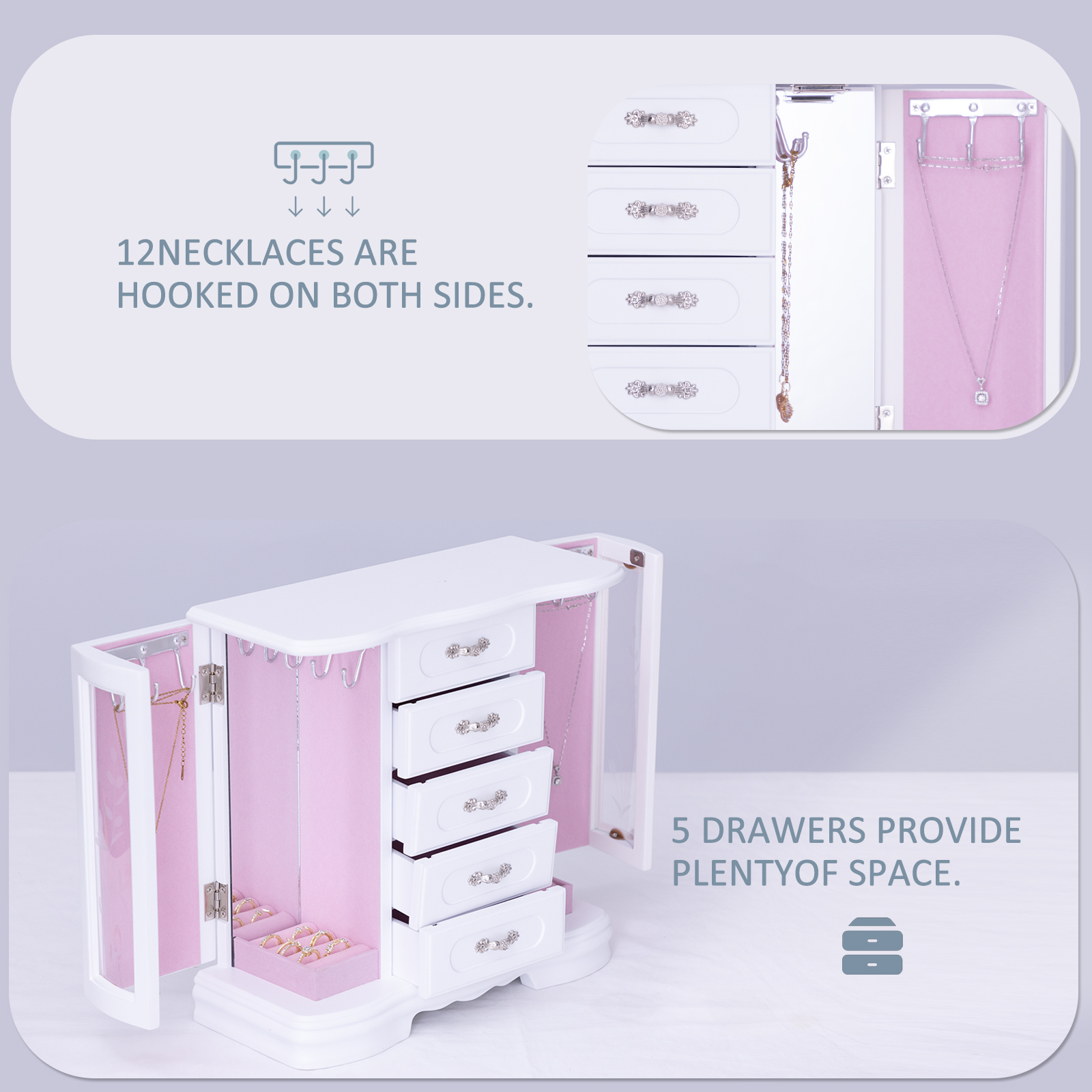 内部多功能设计:珠宝柜盒盖内侧内置镜子,方便试戴珠宝。两侧的项链挂钩可使项链整齐有序地排列,避免缠绕,确保安全存放。这款优雅的梳妆盒是妥善存放珠宝、方便取放的终极解决方案。
