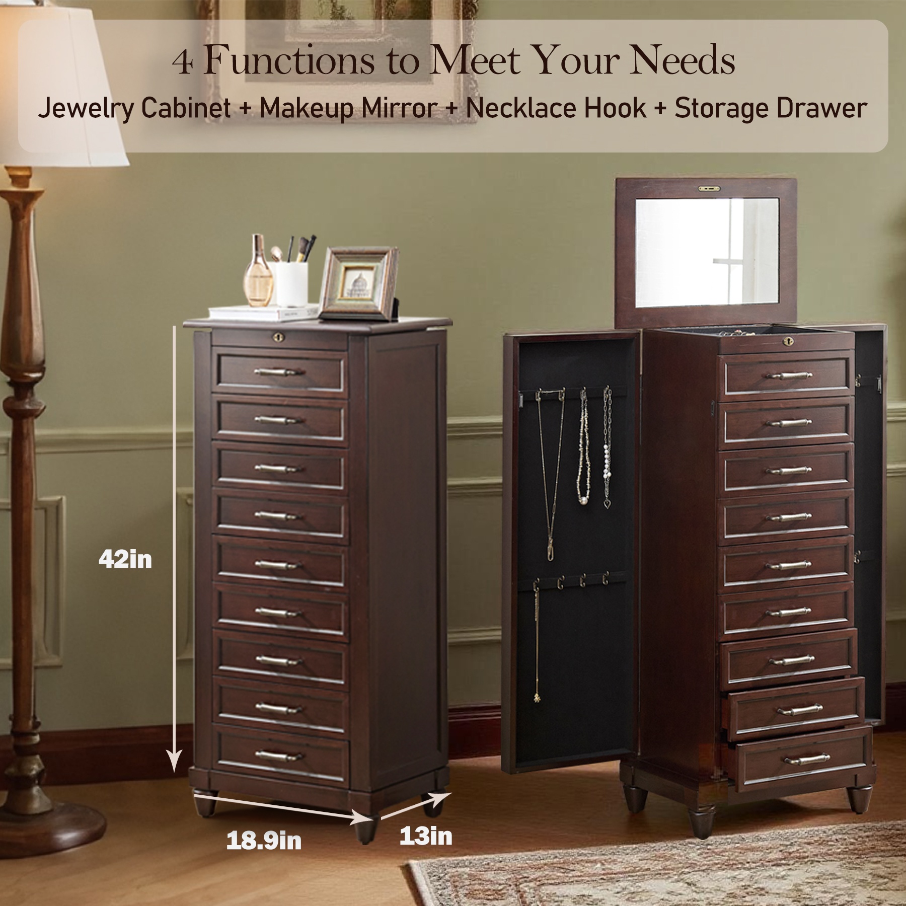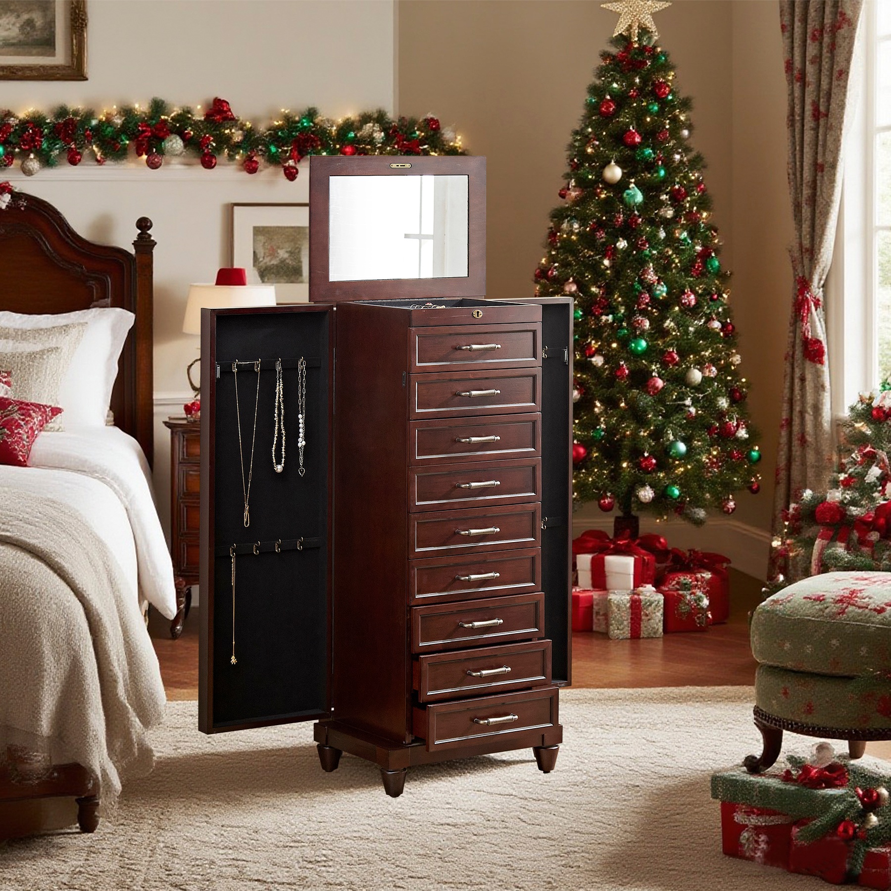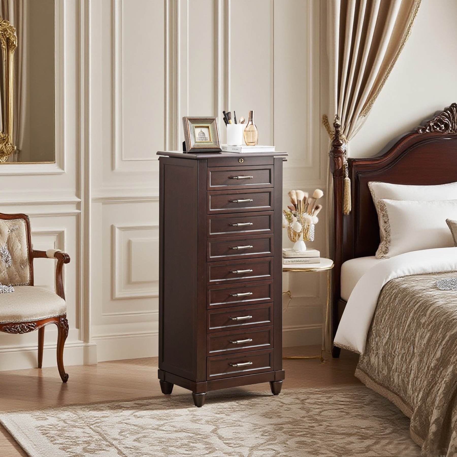 8个抽屉珠宝柜 - 这款奢华珠宝柜不仅拥有精美的工艺,更拥有 8 个宽敞的毛毡内衬抽屉,可存放您珍藏的众多物品。顶部采用皇冠造型,无论在最精致的房间还是简约的卧室,都能轻松摆放。这款雅致的珠宝柜采用精湛工艺和高品质仿古棕色饰面制成,并配有专门设计的隐藏式锁定装置,可锁定所有抽屉,确保物品安全无虞。