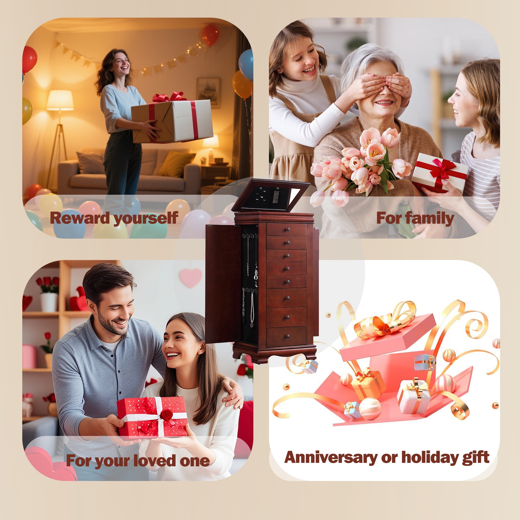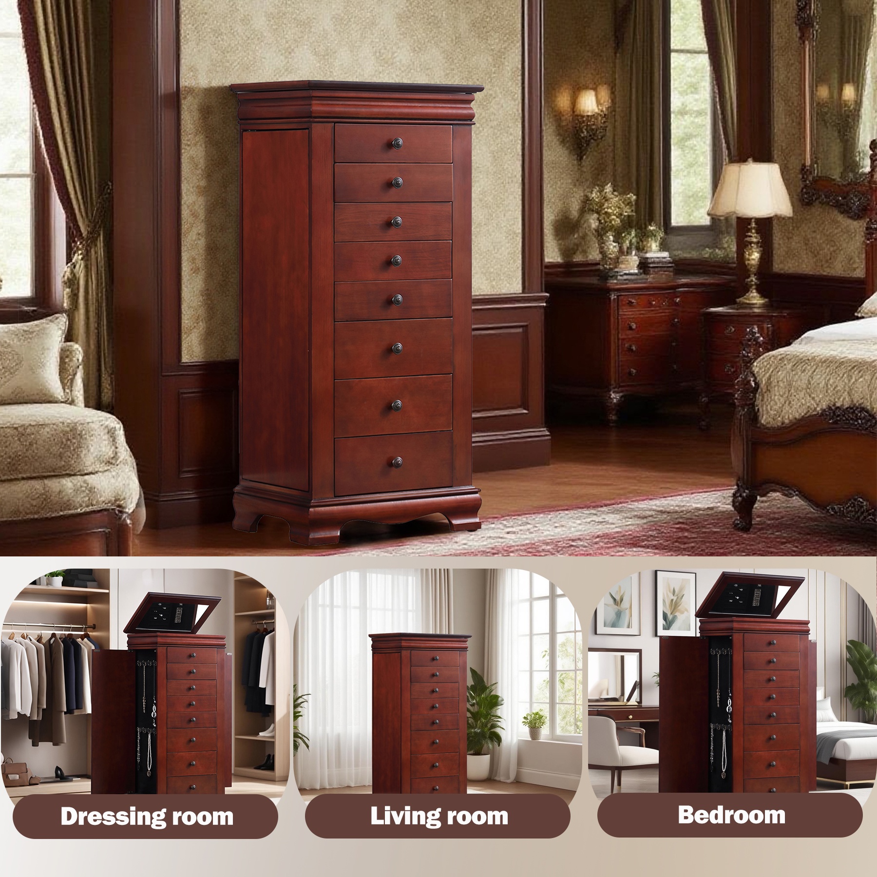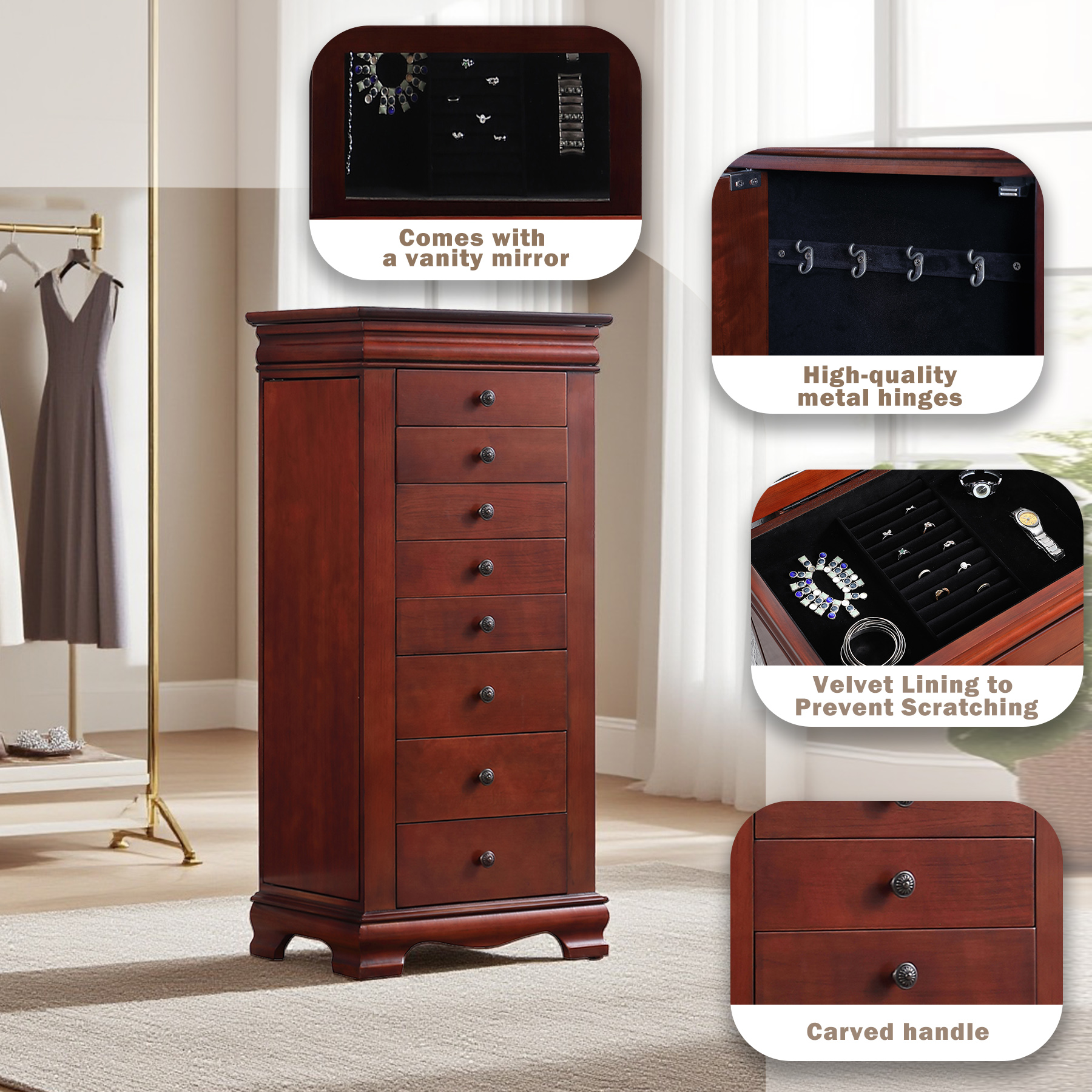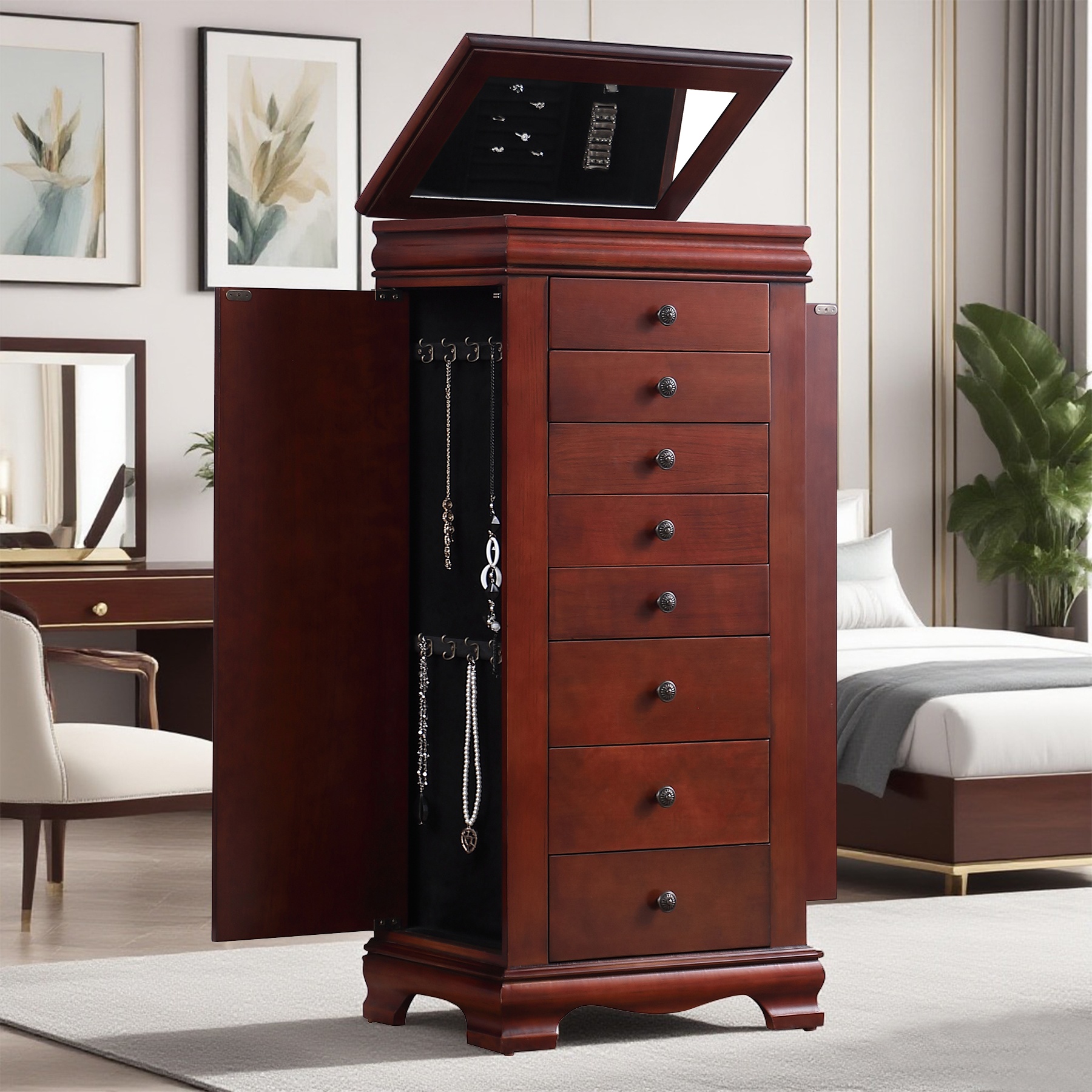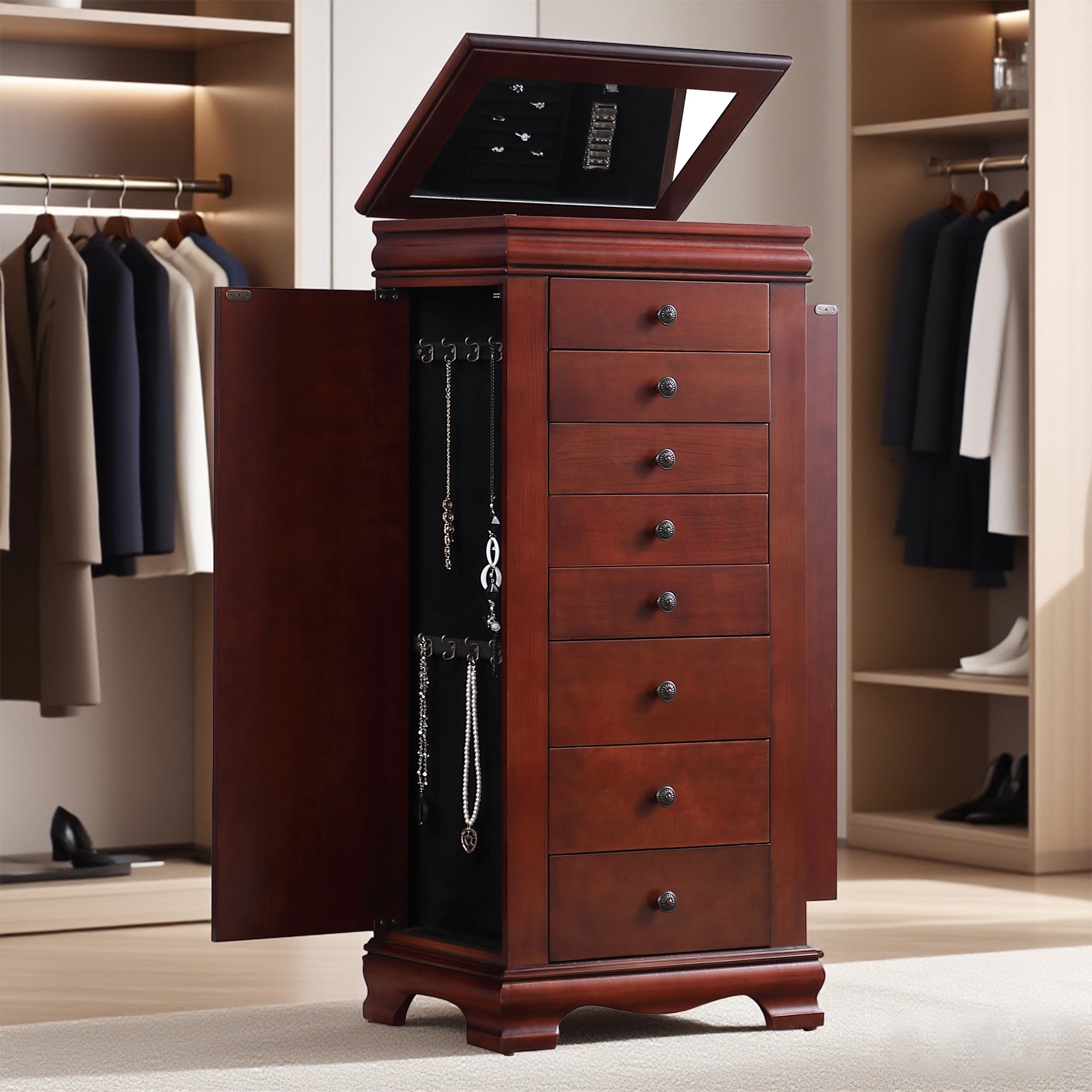 带镜子的珠宝柜,带8个抽屉和侧开门的珠宝柜,项链、戒指和耳环的珠宝柜解决方案