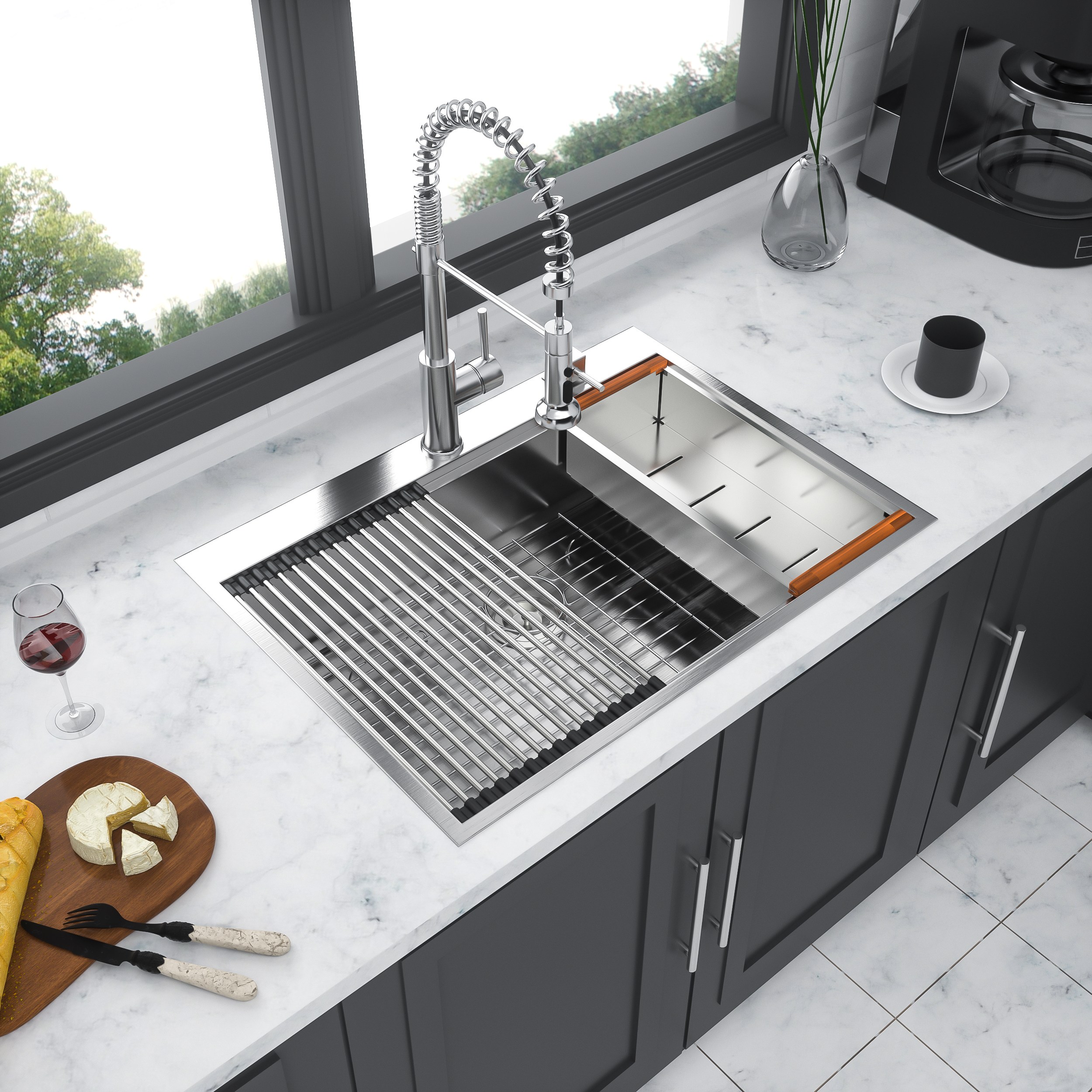 这款不锈钢厨房水槽与创新配件组合,专为提升您的厨房体验而设计。此多功能工作台水槽融合了实用性与优雅,提供了一种无缝整合的风格、便利与耐用性。它为现代厨房提供了宽敞的空间,方便洗涤、冲洗、切割和晾干,让您轻松应对餐前准备和清理工作。无论您是经验丰富的厨师,还是仅仅希望升级厨房设备的人,这款水槽都能完美平衡形式与功能。高质量的不锈钢结构确保它将成为您厨房的中心,陪伴您多年,而配套的配件则提供了额外的功能。精美的木质切菜板和晾干架与设计完美融合,帮助您简化工作并保持厨房整洁有序。