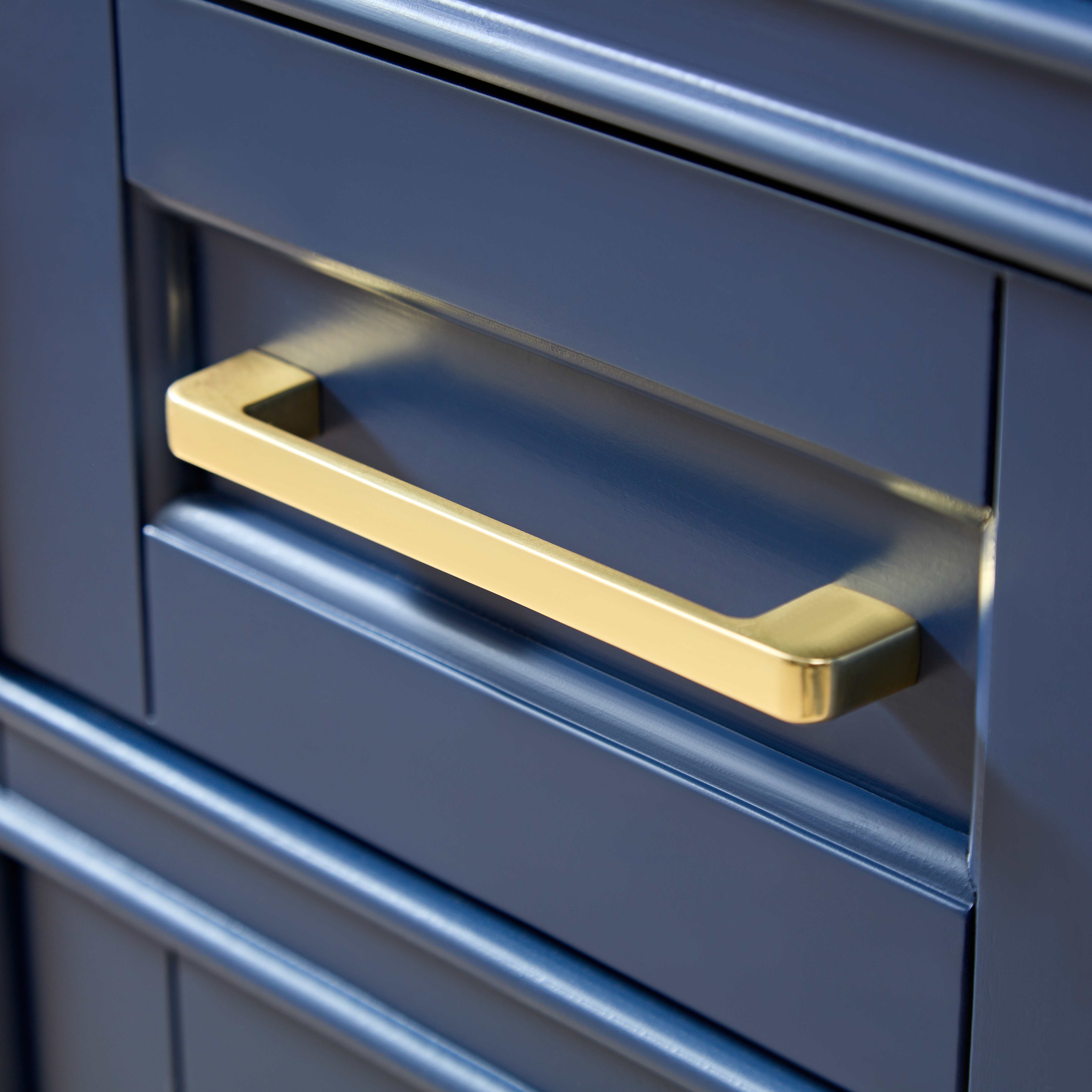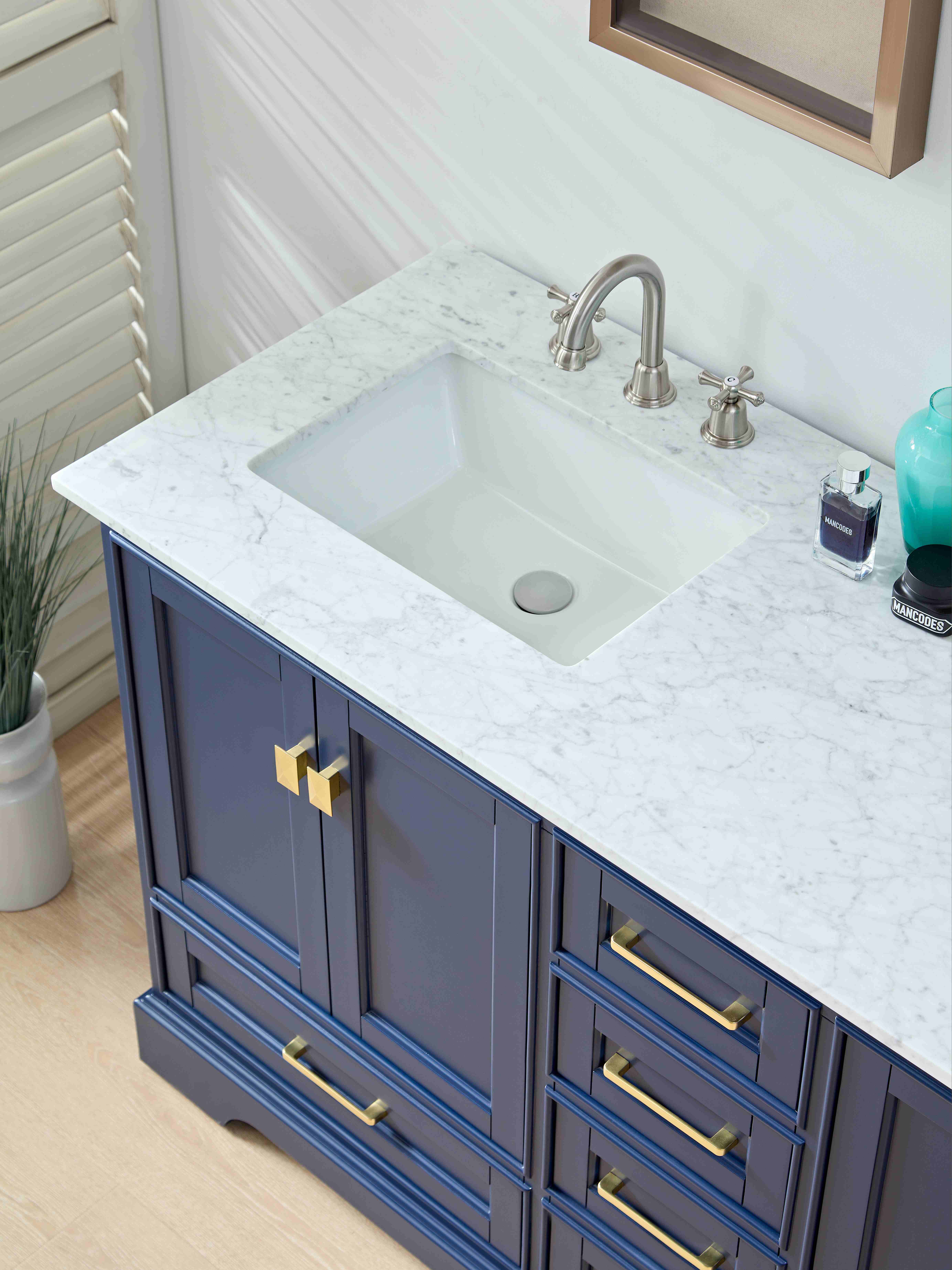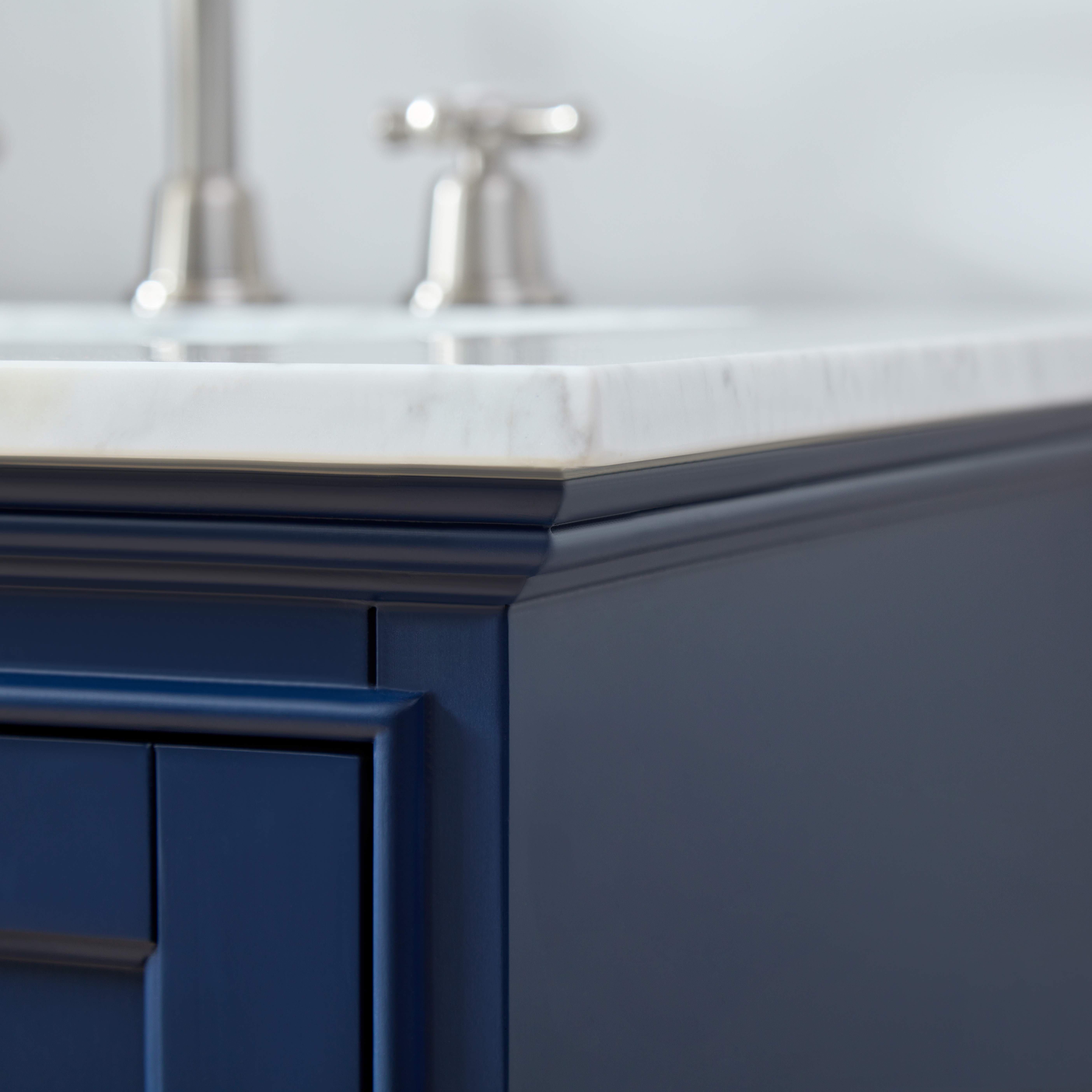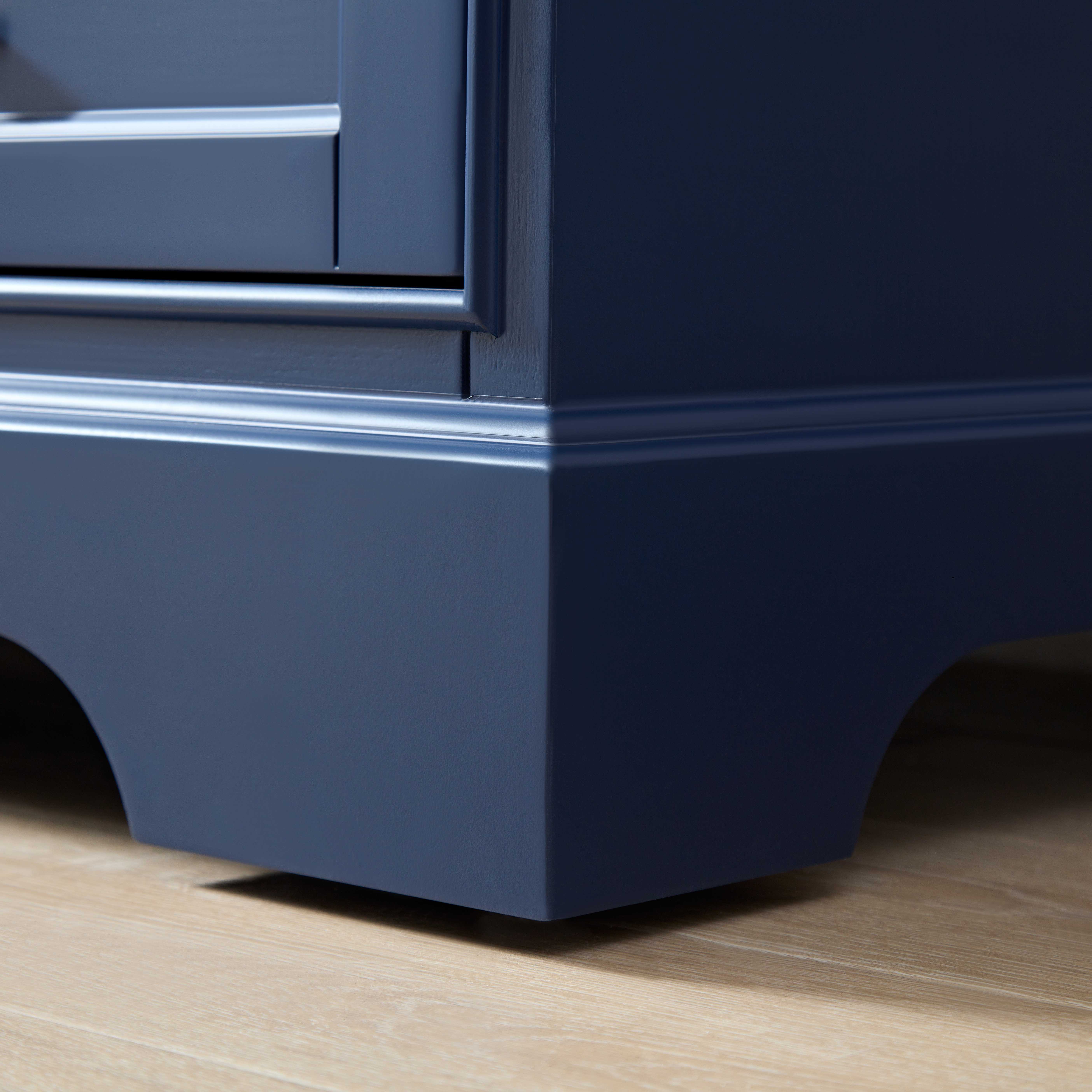 时尚现代的海军蓝色外观:柜体采用经典的海军蓝色,既显得低调优雅,又为浴室增添了现代感。其深沉的色调能够与各种家居风格和装饰相搭配,带来沉稳且具有艺术感的视觉效果。