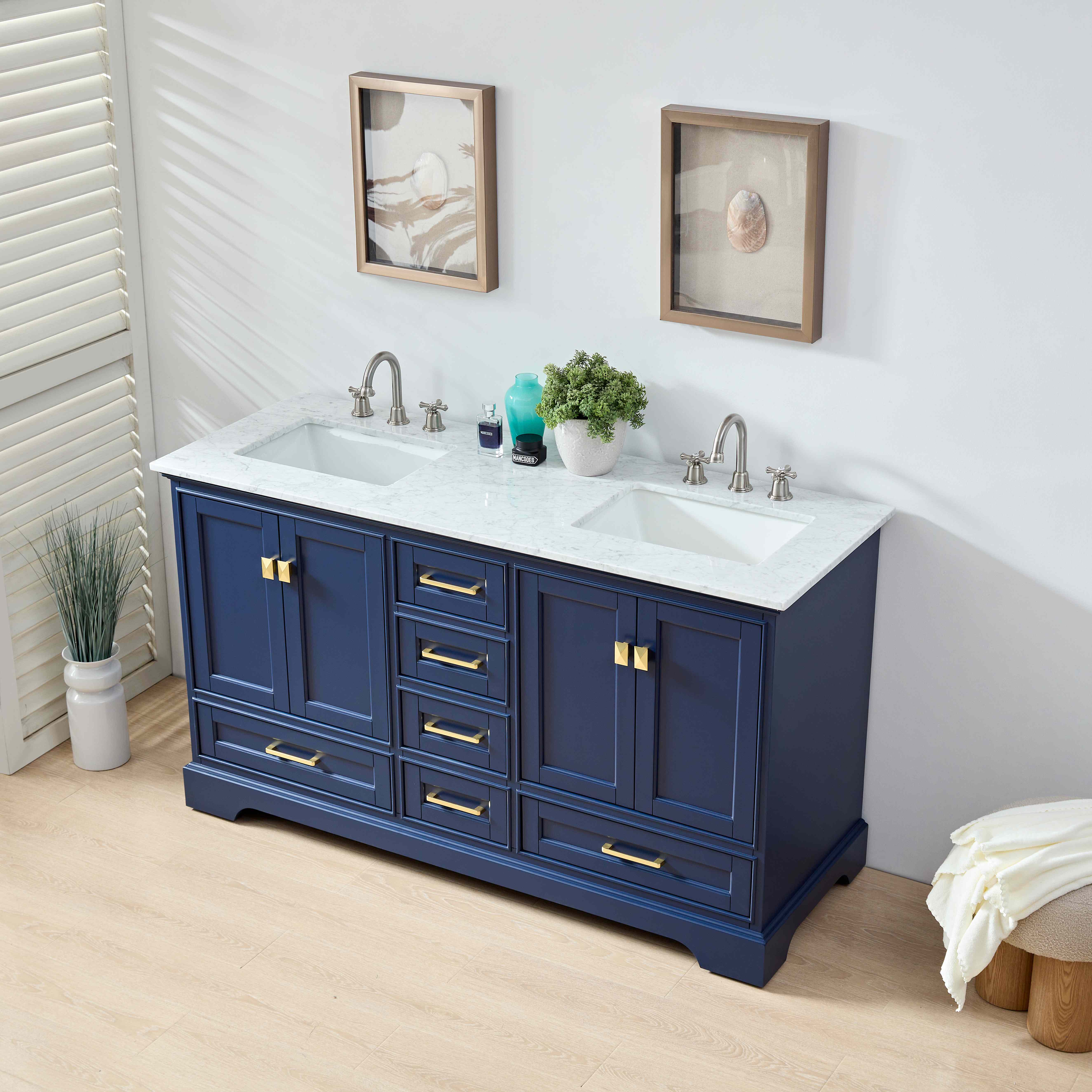 探索这款现代双盆浴室柜,完美融合了经典与现代设计,带来奢华和实用的浴室体验。其深邃的海军蓝色调搭配大理石台面,创造出既时尚又经典的浴室装饰,能够与任何现代浴室风格无缝融合。无论是为家庭、酒店还是高级公寓增添一抹奢华的气息,这款浴室柜都能提供充足的收纳空间,同时不失美观。双盆设计使得家庭成员或宾客可以同时使用浴室而不必排队,极大提升了使用便利性。配有金色的现代把手,突显了细节的精致,带来令人惊叹的视觉效果。台面采用天然大理石,优雅的白色纹理增添了整体的高端感,易于清洁且耐用。宽敞的抽屉和柜门设计提供了大量的存储空间,让您可以有序存放洗漱用品、毛巾、洗浴用品等。